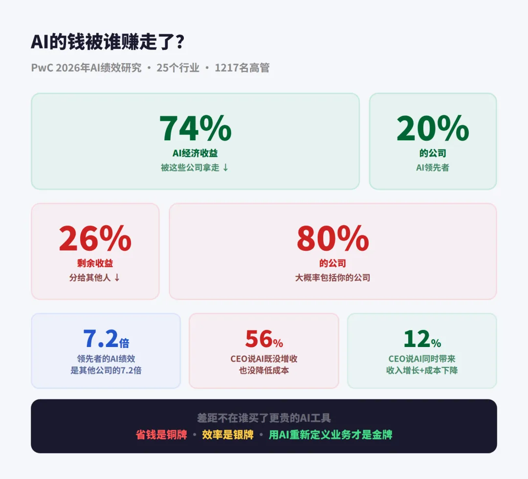 🔴 PwC今天发布2026年AI绩效研究,调查了25个行业的1217名高管。 核心发现:AI的74%经济收益被20%的公司拿走了。剩下80%的公司——大概率包括你公司——分剩下那26%。
