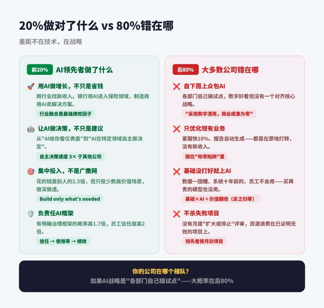 📊 关键洞察:领先公司不是部署了更多AI工具,而是用AI做了不同的事。 差距不在技术,在战略。