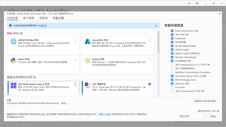 (1)在微软商店里面,搜索并安装 Visual Studio Community,并勾选“.NET Desktop Development(.NET 桌面开发)”工作模块。安装完成后,系统会自带 CorFlags 工具。