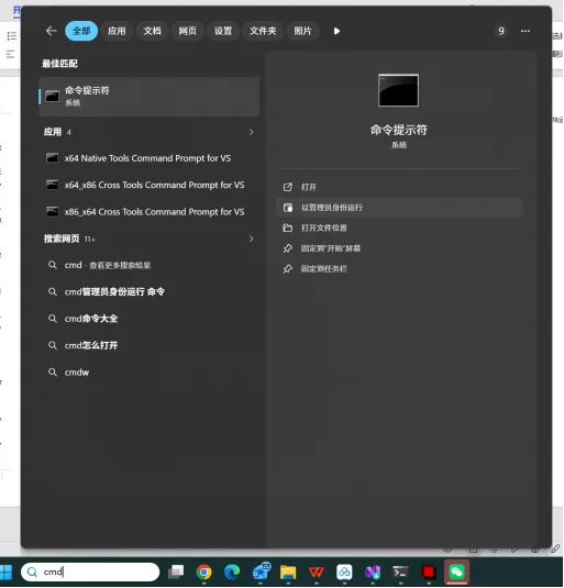 (1)开始界面输入“cmd”,选择“命令提示符”