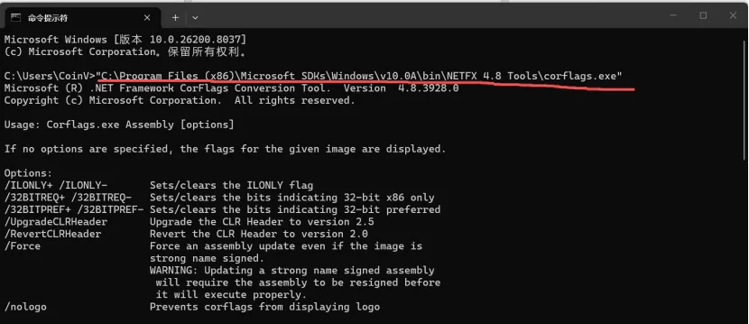 (红色的就是路径,粘贴好后敲回车,会出现下面的这些东西,里面出现“Microsoft (R) .NET Framework CorFlags Conversion Tool”,就说明CorFlags配置成功)