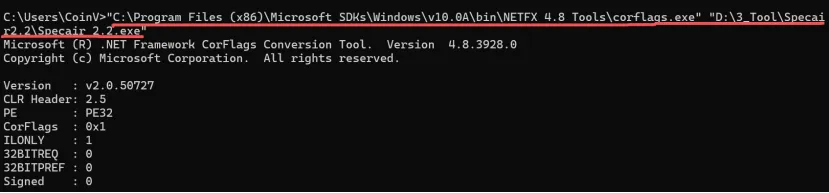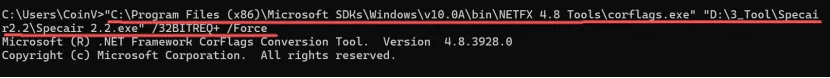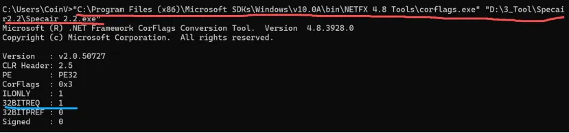 “C:\Program Files (x86)\Microsoft SDKs\Windows\v10.0A\bin\NETFX 4.8 Tools\corflags.exe” “D:\3_Tool\Specair\Specair.exe”
