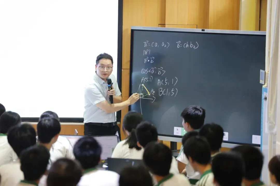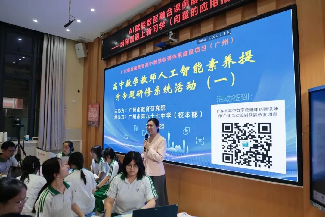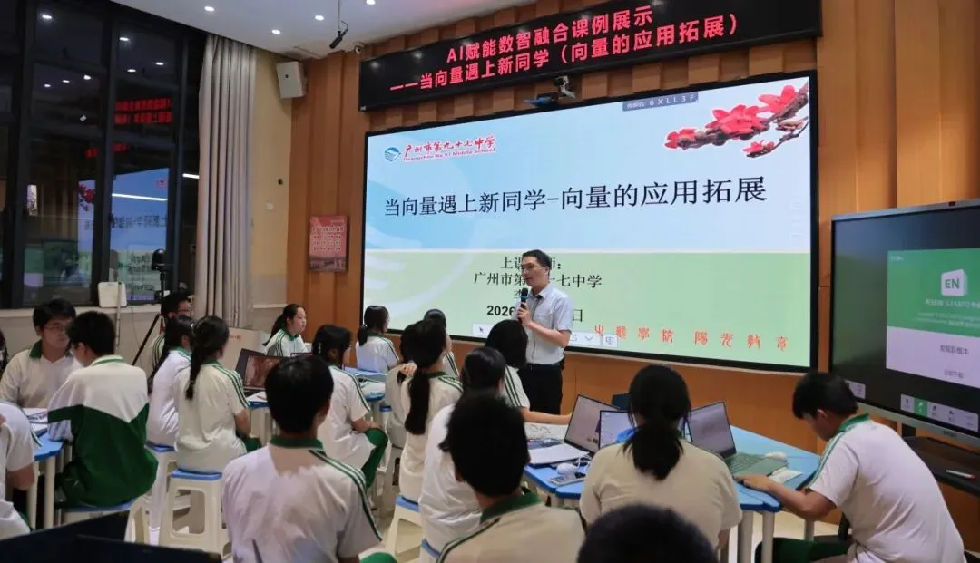 广州市第九十七中学李英东老师与微信小程序班高一1班的同学们,一起呈现了一节人工智能赋能高中数学课堂教学公开课《当向量遇见新同学》。