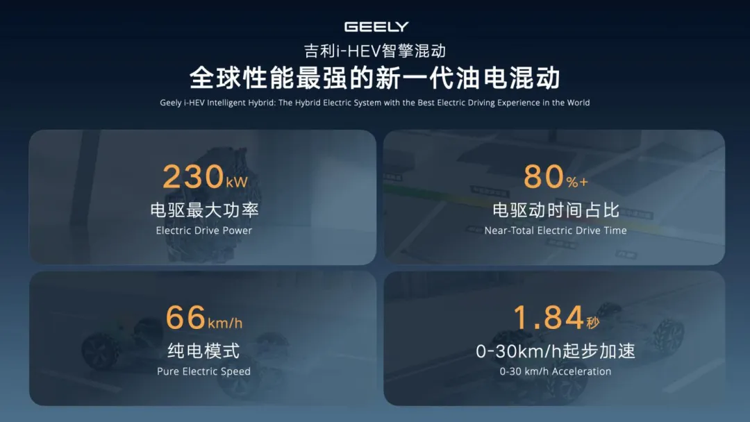 性能上,吉利i-HEV实现了从“油驱为主”到“电驱为主”的代际跨越。不同于日系混动小功率电机与发动机捆绑工作的模式,其创新采用“电混同构”方案,实现发动机与电机完全解耦,搭载的11合1混动电驱最大功率达230kW,是日系混动的1.72倍。这意味着,车辆在WLTC工况下拥有80%以上的电感体验,66km/h可实现纯电行驶,0-30km/h起步加速仅1.84秒,比日系混动快18%,动力响应仅需10毫秒,彻底摆脱了“混动=动力弱”的标签。更难得的是,其通过智能降噪、振动控制技术,让发动机噪音仅比纯电高1分贝,实现了性能、平顺性与静谧性的三重提升。