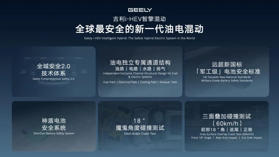 在安全与可靠性上,吉利延续了“安全第一”的造车理念,填补了行业多项空白。针对传统混动“单动力源故障即趴窝”的痛点,i-HEV采用动力冗余安全专利技术,三个动力源完全解耦,任一部件失效仍可正常行驶;电池方面,平板液冷专用电池提前满足2025年安全新国标,IP68防尘防水等级远超国标48倍,配合神盾电池安全系统的实时预警,全方位筑牢安全防线。可靠性上,1.5万小时台架耐久试验、跨越温差近100℃的极限环境测试,让其通过中国汽研“混动系统可靠性铁人七项耐久”认证,用严苛测试重塑了混动“开不坏”的新标准,也打消了消费者对国产混动可靠性的顾虑。