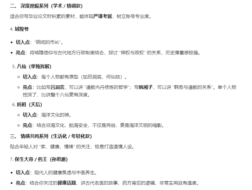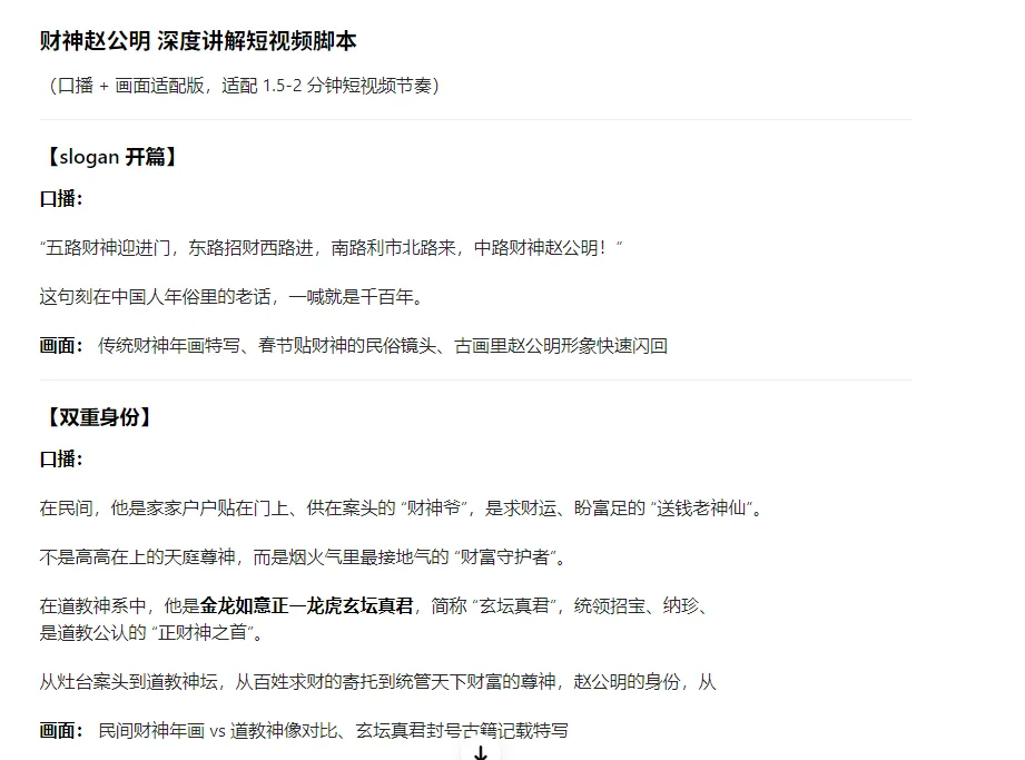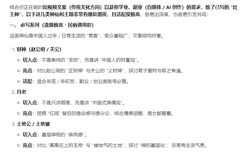 素材方面,如果能搜到对应神仙的史料或民间故事,直接投喂给AI,生成的文案会更细、更有料。
