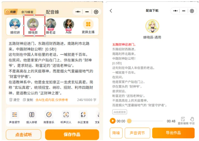 多测试几种,找到最符合内容气质的那个。阿轩演示用的是配音蜂的「蜂晓辰」音色。