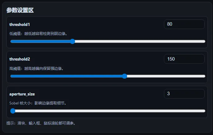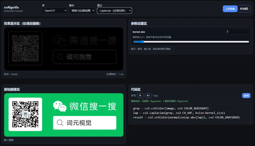 它本质上是一个可交互的计算机视觉实验工作台:前端负责实时调参和展示,后端用视觉算法处理图像并返回结果。你改一个参数,界面就立刻刷新,不需要反复改代码、保存、重跑、再对比。