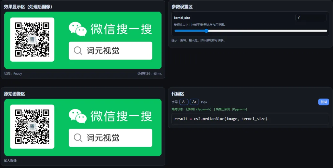 左上:效果显示区(处理后图像) 右上:参数设置区 左下:原始图像区 右下:代码区