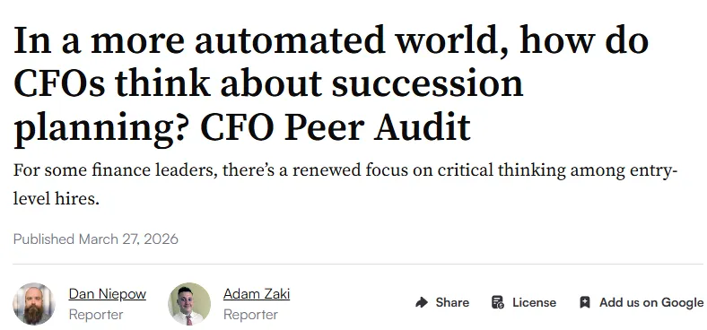 但问题往往是双向的:如果没有年轻员工源源不断的补充,财务团队终有一天会发现无人接班。近期CFO.com网站就此向几位财务高管提出了这一问题:在初级职位日益自动化的当下,您是如何考虑继任计划的? 他们的回答揭示了解决这一复杂问题的各种可行策略。