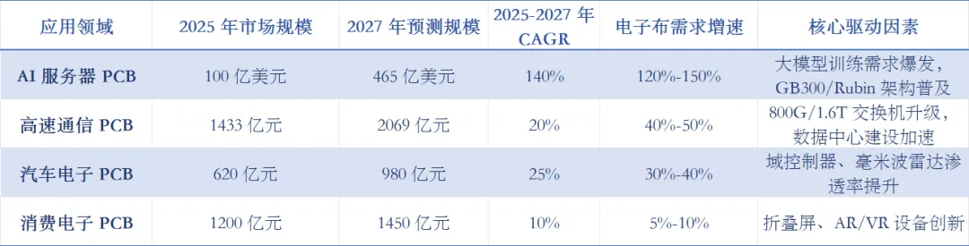 下游以覆铜板 (CCL)、PCB 为核心,最终应用于 AI 服务器、通信设备、汽车电子等领域,AI 算力基础设施建设是本轮需求爆发的核心引擎。