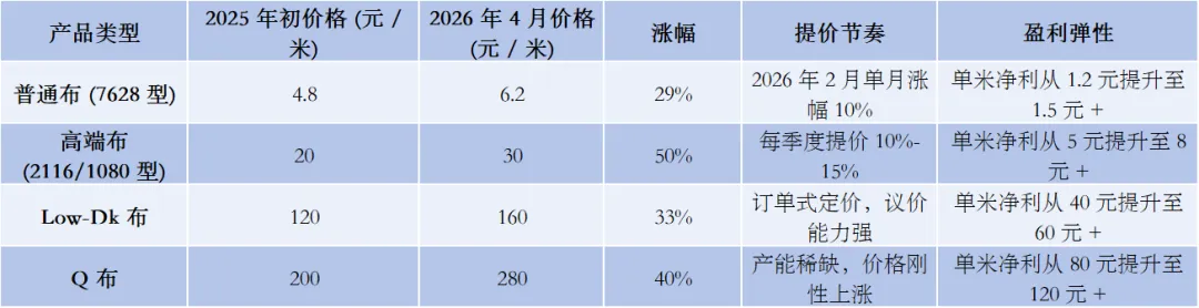 关键补充:上述为普通 E 玻纤布 CCL 的成本占比,在 AI 服务器、高速通信等高端场景使用的Low-Dk/Q 布高端 CCL中,因电子布单价较普通布提升 3-10 倍,其成本占比可攀升至25%-40%,成为高端 CCL 的核心成本项,直接决定产品定价与盈利空间。