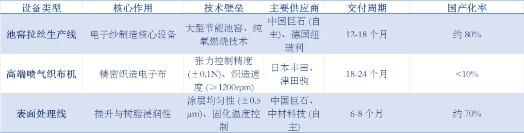 核心瓶颈:全球高端喷气织布机年产能仅 2400 台,2026 年缺口达 6.1%,2027 年扩大至 10.6%,是电子布扩产的 “硬约束”,导致高端电子布供给紧张、交付周期持续延长。