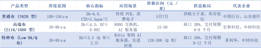 电子布按厚度与性能分为三大类,市场呈现 “低端饱和、高端紧缺” 的结构性特征: