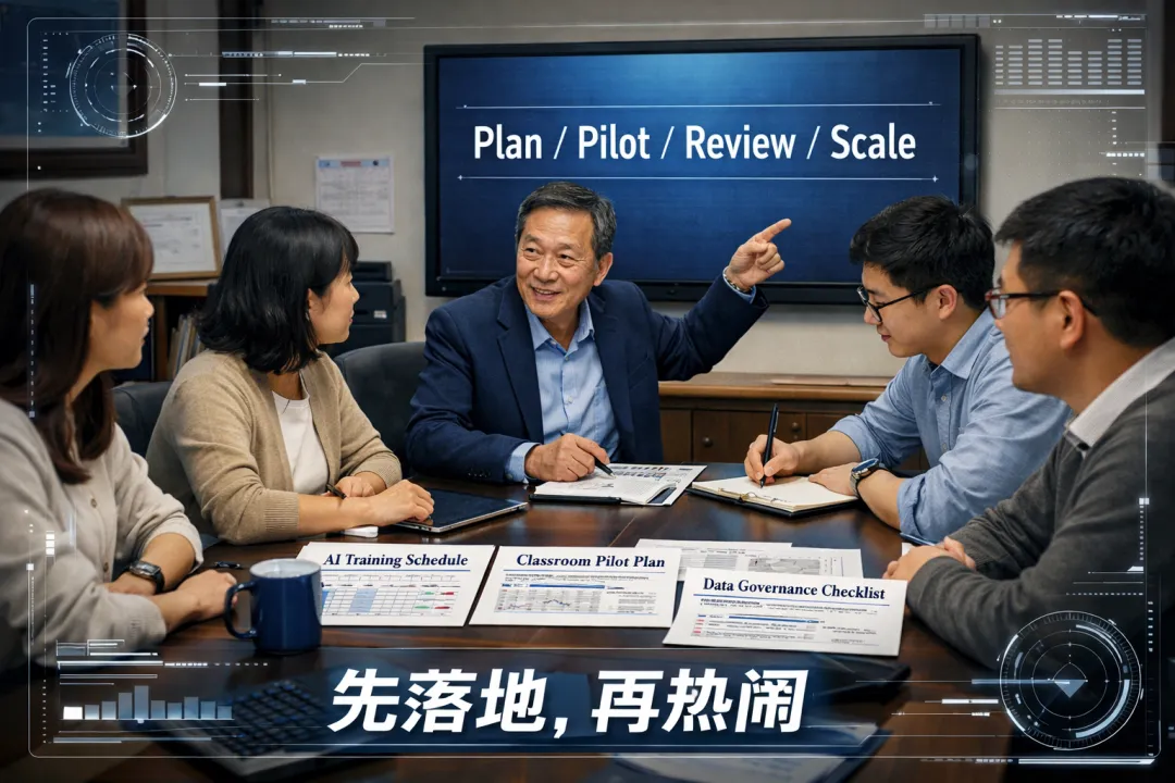 别把AI当成宣传口号,要把它当成组织变革。你真正要管的,不是“学校有没有AI”,而是“有没有培训、有没有规则、有没有复盘”。