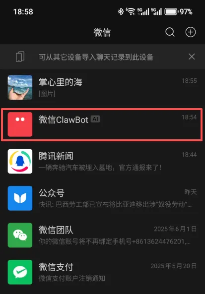 同时,微信通讯录里会出现「微信ClawBot」