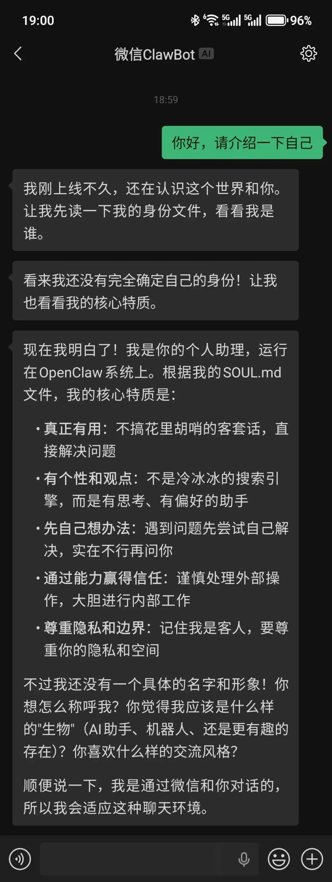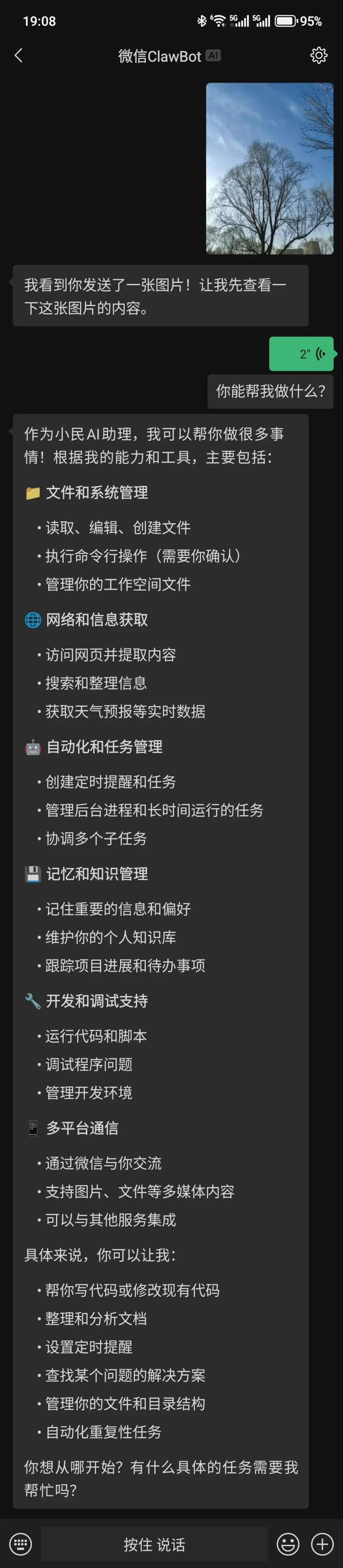 定时任务:发「每10分钟整理一次科技热点发给我」 文件处理:丢个PDF过去,让它「总结这份文档」 语音指令:不想打字就发语音,识别挺准的