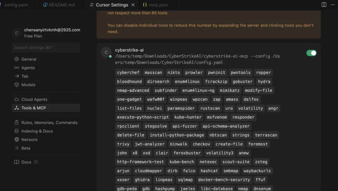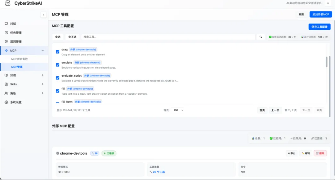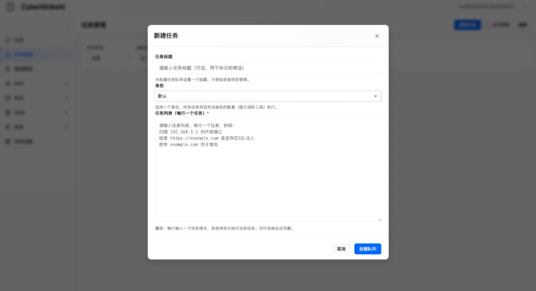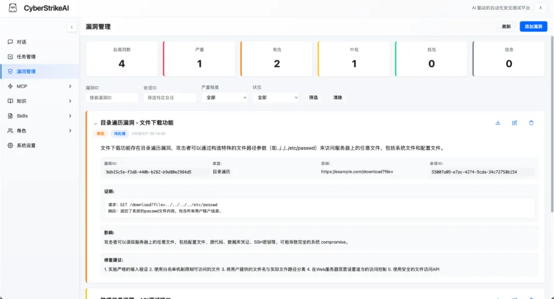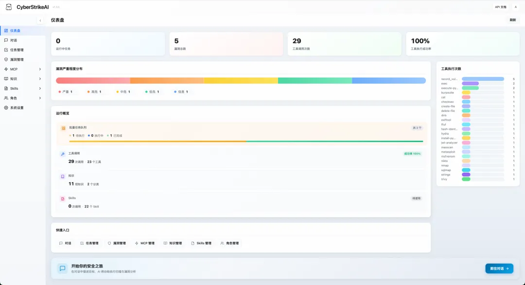 🤖 兼容 OpenAI/DeepSeek/Claude 等模型的智能决策引擎 🔌 原生 MCP 协议,支持 HTTP / stdio / SSE 传输模式以及外部 MCP 接入 🧰 100+ 现成工具模版 + YAML 扩展能力 📄 大结果分页、压缩与全文检索 🔗 攻击链可视化、风险打分与步骤回放 🔒 Web 登录保护、审计日志、SQLite 持久化 📚 知识库功能:向量检索与混合搜索,为 AI 提供安全专业知识 📁 对话分组管理:支持分组创建、置顶、重命名、删除等操作 🛡️ 漏洞管理功能:完整的漏洞 CRUD 操作,支持严重程度分级、状态流转、按对话/严重程度/状态过滤,以及统计看板 📋 批量任务管理:创建任务队列,批量添加任务,依次顺序执行,支持任务编辑与状态跟踪 🎭 角色化测试:预设安全测试角色(渗透测试、CTF、Web 应用扫描等),支持自定义提示词和工具限制