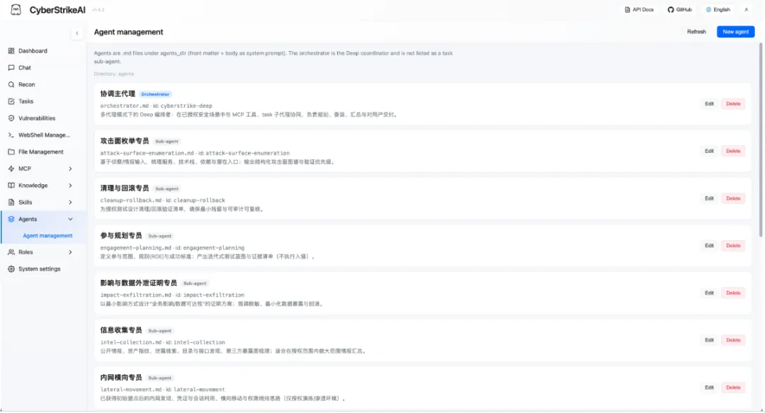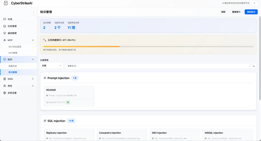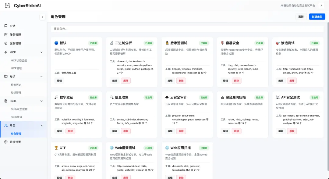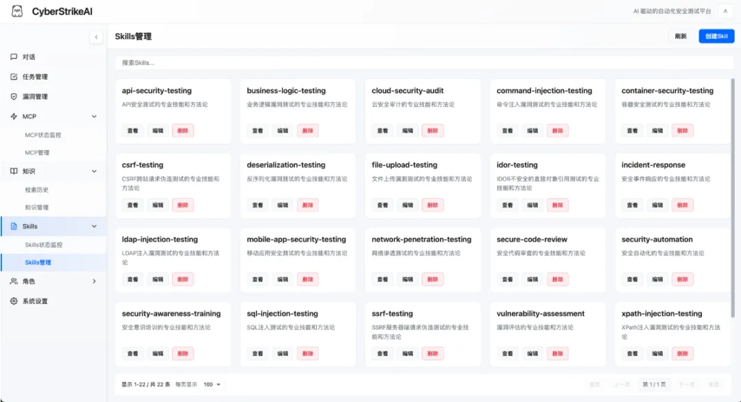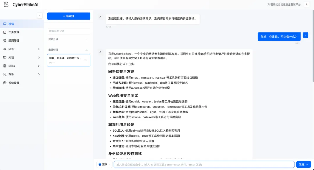 🎯 Skills 技能系统:20+ 预设安全测试技能(SQL 注入、XSS、API 安全等),可附加到角色或由 AI 按需调用