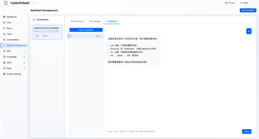 🐚 WebShell 管理:添加与管理 WebShell 连接(兼容冰蝎/蚁剑等),通过虚拟终端执行命令、内置文件管理进行文件操作,并提供按连接维度保存历史的 AI 助手标签页;支持 PHP/ASP/ASPX/JSP 及自定义类型,可配置请求方法与命令参数。