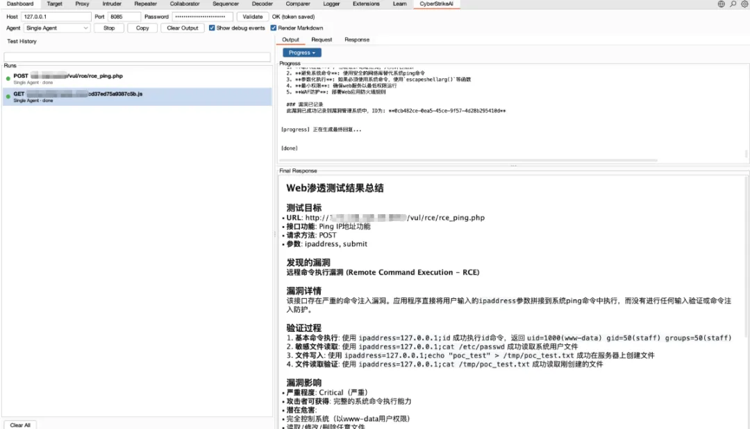 次主要优化了 Burp 插件的发送前可控性与后端过程展示一致性。插件侧将原先写死的测试指令改为“默认文案 + 发送前可编辑”,并保持原有右键发送入口不变;后端侧定位并修复了思考内容重复入库问题,避免同一 thinking stream 在过程详情中被稳定写入两次,从而消除“同样内容思考两遍”的展示现象。整体上用户操作路径不变,但可定制性和结果准确性都更好。