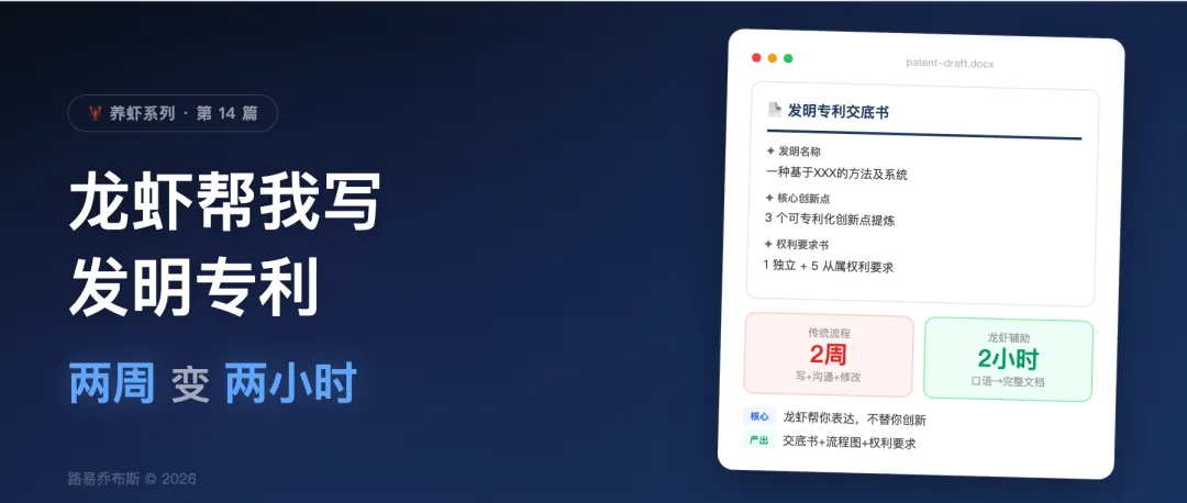 🦞 养虾系列- · 真实场景下用 AI Agent 解决工作问题的实战记录 第14篇目标:今天给大家分享一个值钱的,用AI agent帮你搞定专利说明书。 不论你是技术人员,手上只有一堆代码;抑或你是产品经理,手上是几个产品功能文档,甚至你只有一个PPT想法。快码住收藏,今天的分享绝对让你收获满满! |
