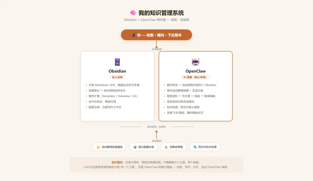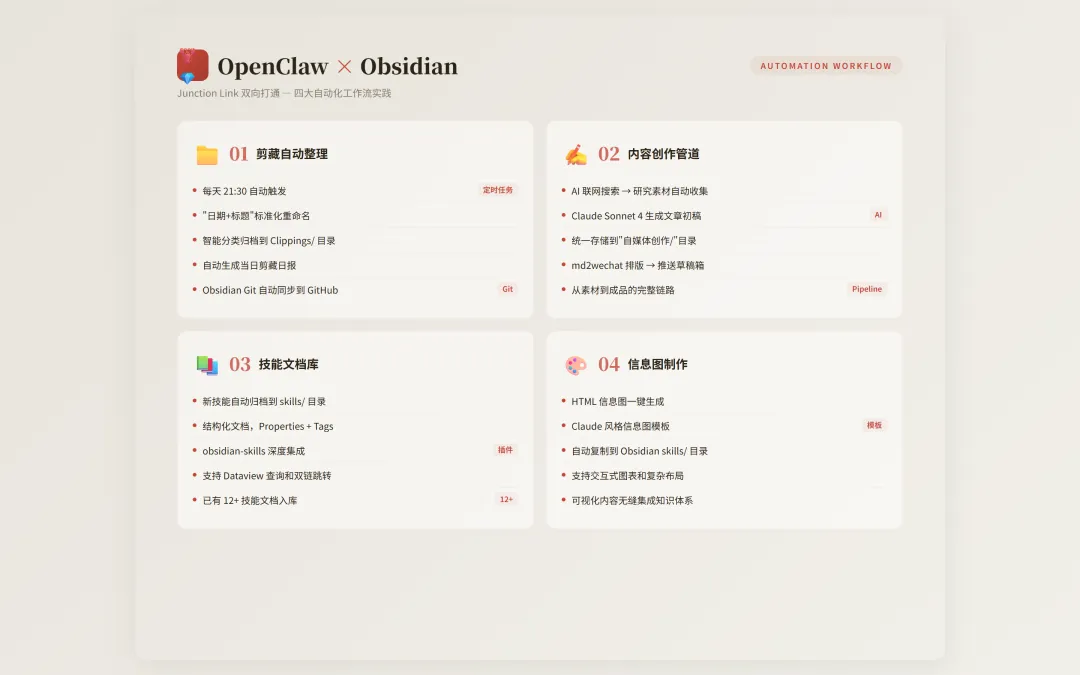 以前大家对于微信公众号等自媒体推文没有比较合适的管理办法,通过Obsidian可以轻松完成内容剪藏,借助Openclaw完成信息整理,总结,复用。当前万物CLI,可以通过Openclaw+CLI打通各种应用,建议试试飞书CLI,飞书是当前国内生态最接近Google的,可以通过Openclaw将各种应用链接到一起。