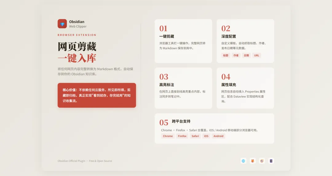 Obsidian(黑曜石) 是一款极其纯粹的笔记与知识管理软件,拥有强大的插件生态,功能强大,所有资料均以Markdown的格式(图片、视频使用本地引用方式)保存在本地。 核心工具 Obsidian Web Clipper:浏览器插件。一个专门为笔记设计的“网页采集器”,能帮你把网上的文章一键变成整齐的 Markdown 文档,直接存进你的 Obsidian 笔记库里。网页、视频都能一键剪藏,而且功能越来越强大。非常适合微信公众号推文的数据采集、管理、应用。