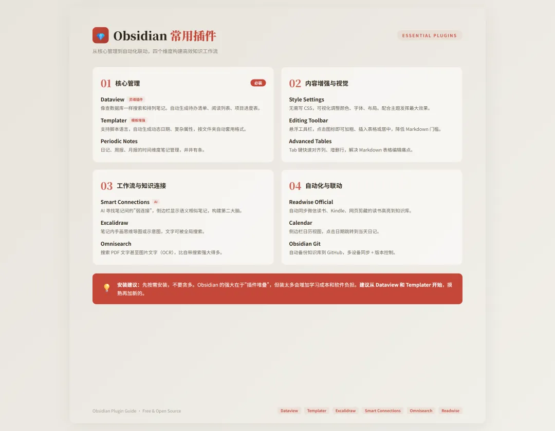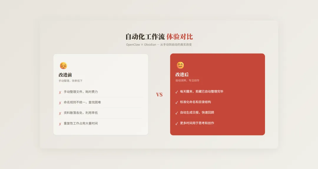 配合 obsidian-skills 插件使用,可以实现对 Obsidian Properties/Tags 元数据的自动化处理,这是单纯使用 OpenClaw 文件操作无法达到的效果。 这套工作流的核心理念是:让 AI 处理重复性的整理工作,人专注于更有价值的思考和创作。经过实际验证,这确实是一个能够显著提升生产力的解决方案。