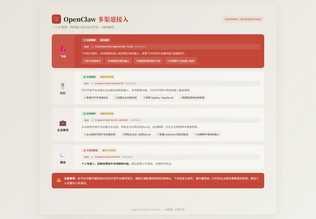 npx -y @openclaw/wechat install企业微信接入: 安装命令参考: