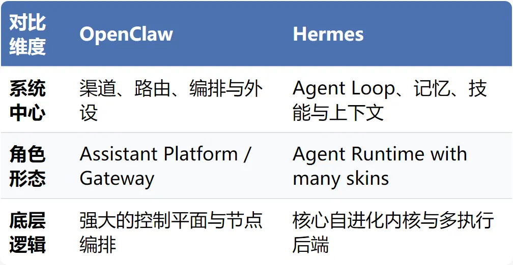 Hermes强调内建学习循环,从经验中提取技能,其技能本质是文档化的资产。