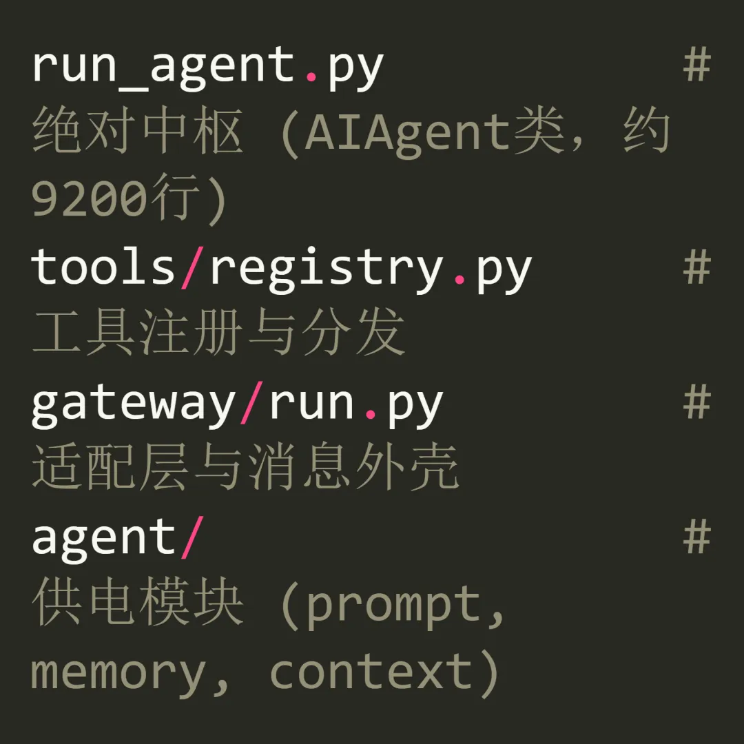 Hermes源码是典型的Python Agent Runtime + 一级子系统,热路径极度集中。CLI、Gateway等最后全部汇集于单一中枢。