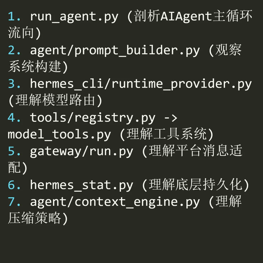 重点文件:run_agent.py。Hermes80%核心行为发生地。涵盖主循环、工具派发、API选择与压缩触发。初始化、系统Prompt前、工具调用前后必下断点。