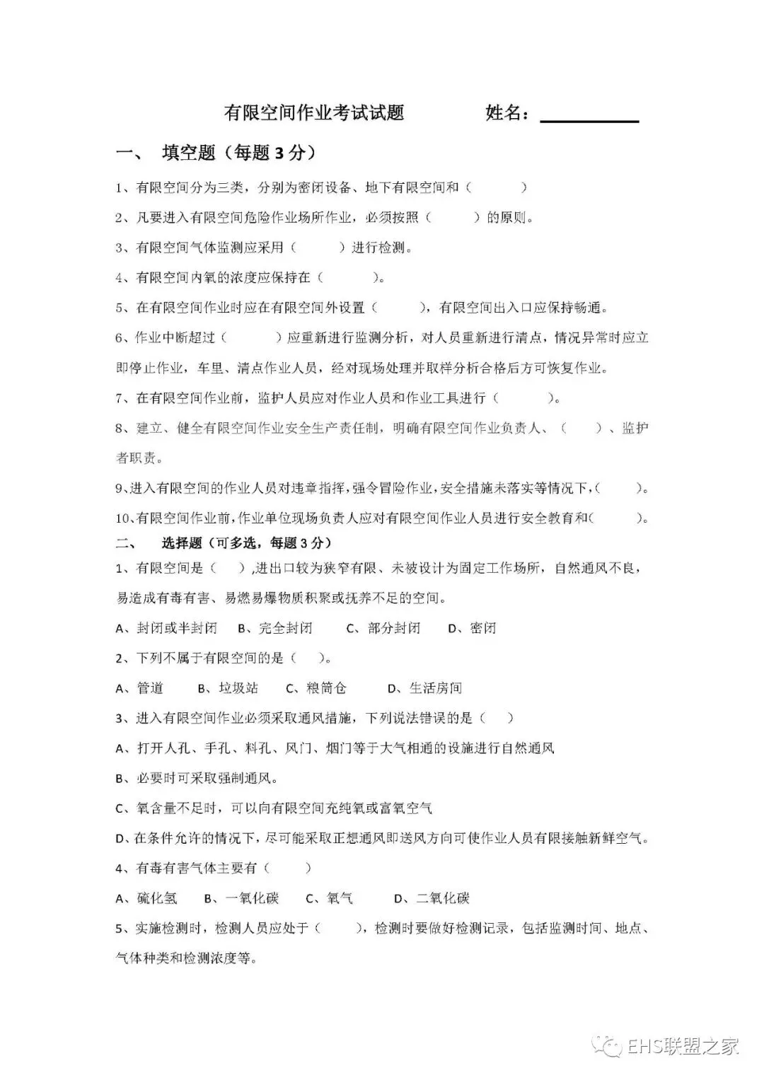 5、有限空间考试试卷题库