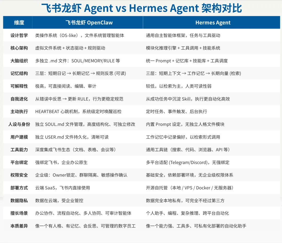 五、对比分析:飞书龙虾Agent VS Hermes Agent