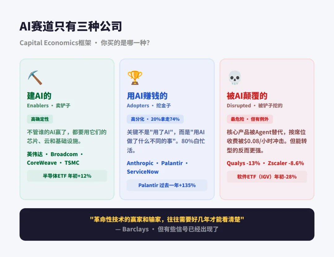 Capital Economics的高级市场经济学家James Reilly提了一个简洁的框架:AI赛道的公司只有三种——Enablers(建AI的)、Adopters(用AI的)、Disrupted(被AI颠覆的)。