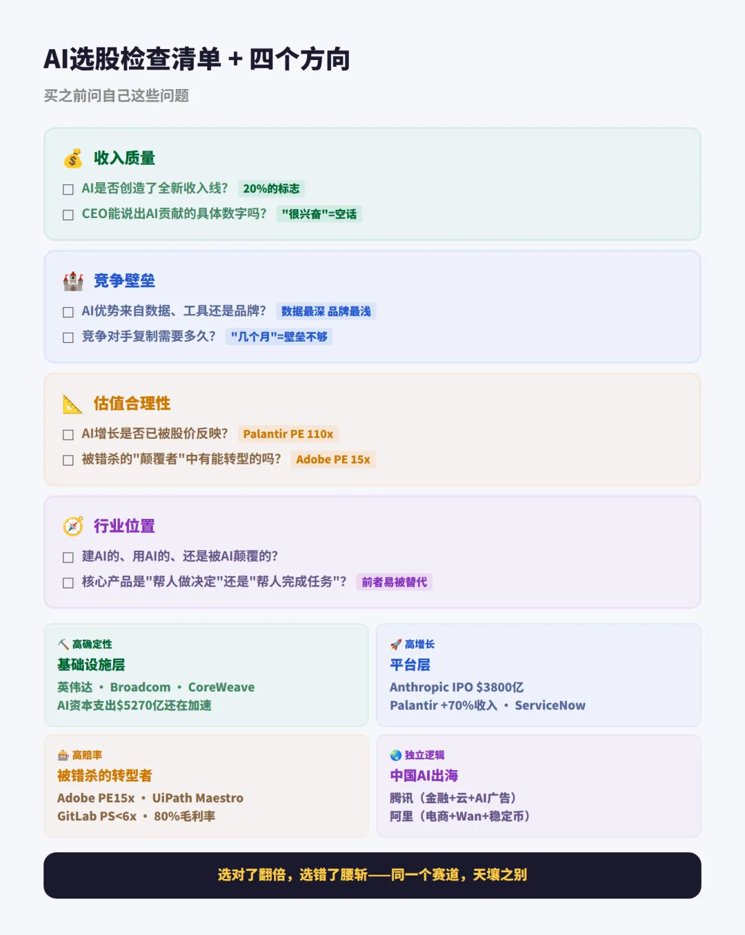 三个问题帮你做判断:它是建AI的、用AI的、还是被AI颠覆的?如果是用AI的——它用AI做了什么不同的事?CEO能说出AI贡献的具体数字吗?