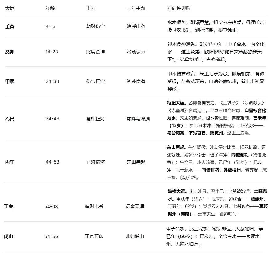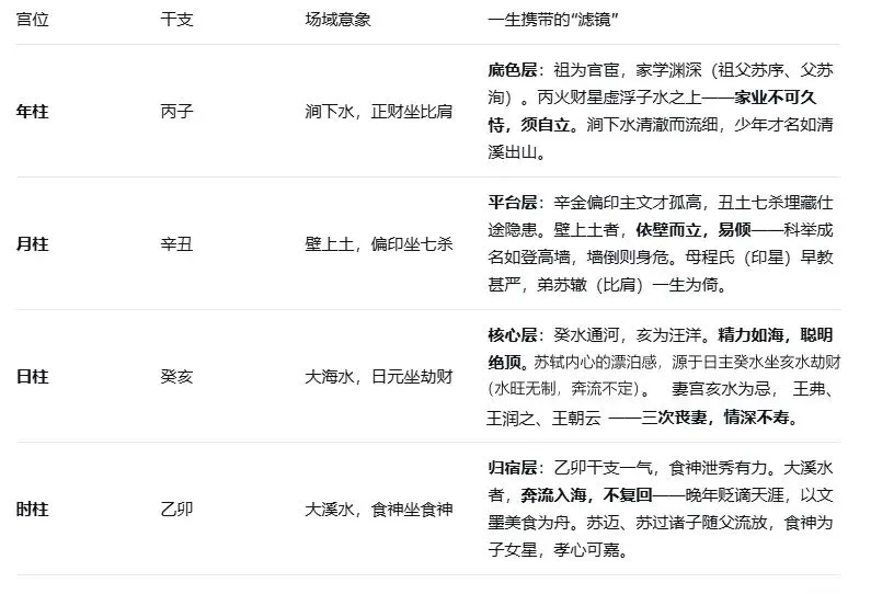 因此,以下分析不追求“这是苏轼真实八字”的考证结论,而是将这副流传的命盘作为一个经典样本,运用我们的框架进行方向性、结构性的解读。