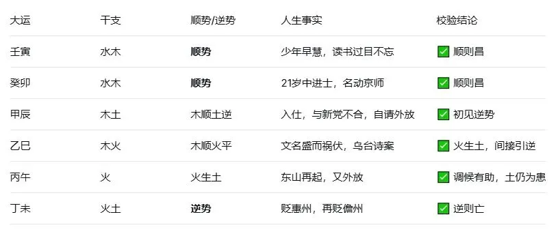 校验通过:前两步顺势大运,人生顺遂;辰运初见土逆,波折始现;未运冲丑破格,远窜天涯。格局定性符合度高。