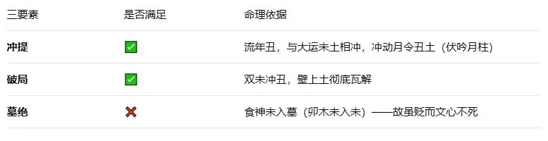 此为 “逆势之根”——大运流年引动未土冲丑、或戊己土透干时,此根苏醒,破格招灾。