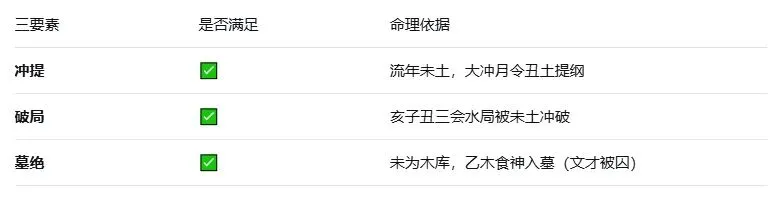 触发条件:①逢未土冲丑;②逢戊己土透干克水;③逢巳酉丑三合金局,生水过寒反成祸。