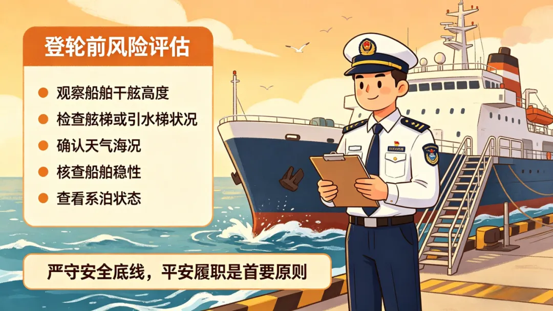 登轮前必须完成风险评估:观察船舶干舷高度、舷梯或引水梯状况、天气海况、船舶稳性及系泊状态。
