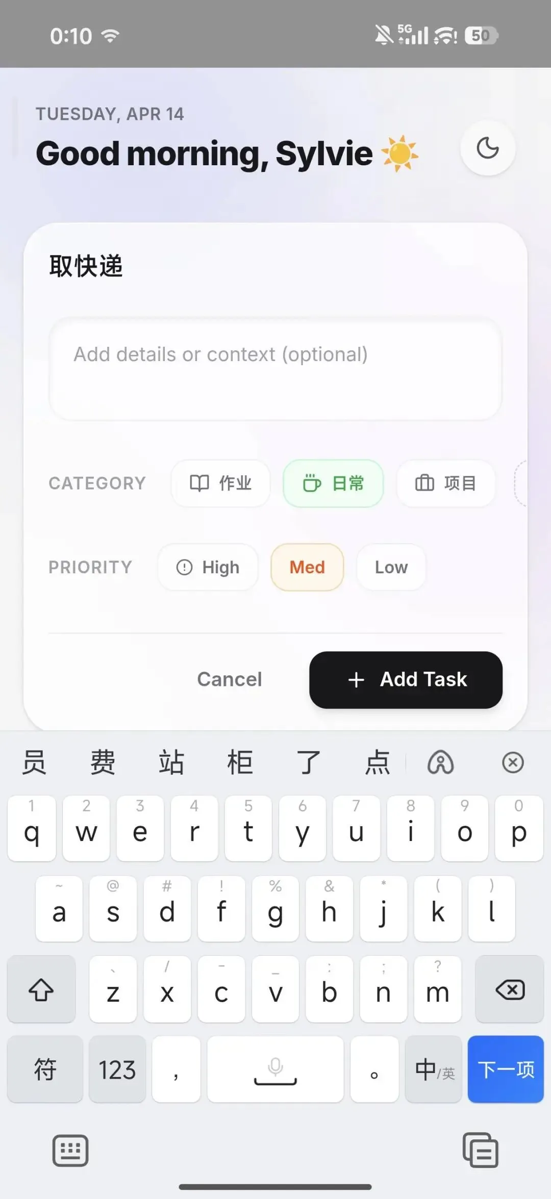 输入框可以将任务归类,本人设立了作业,日常,项目,课外等等,也可以自定义。