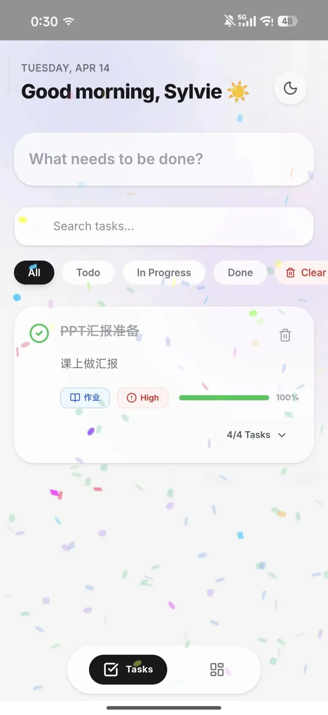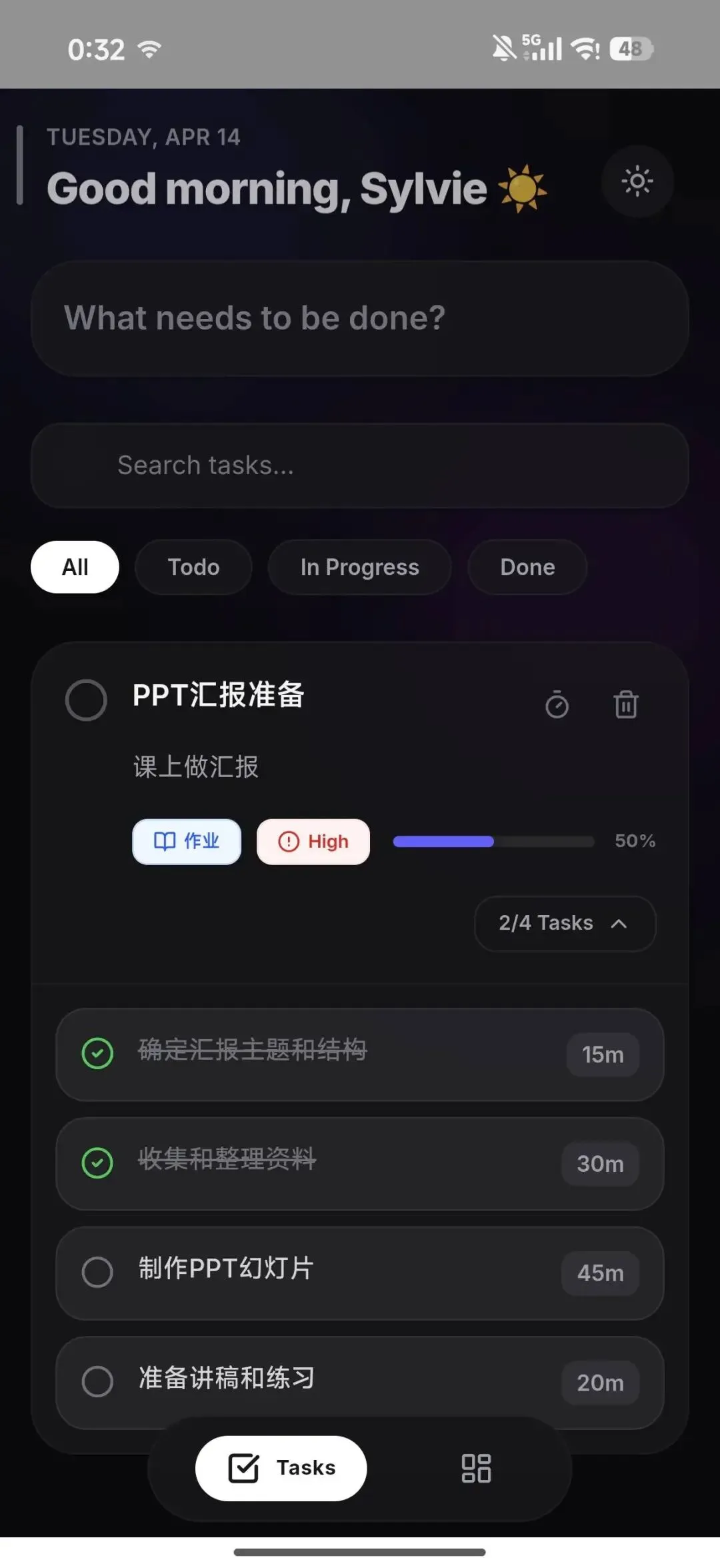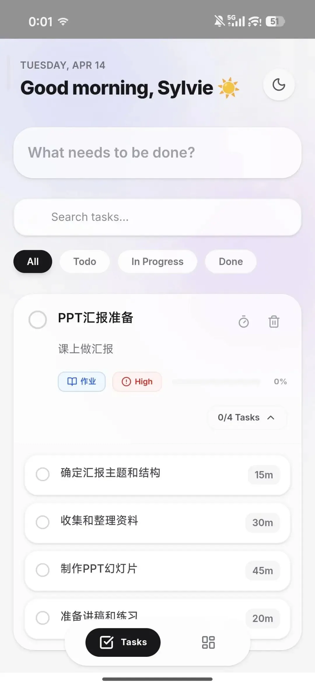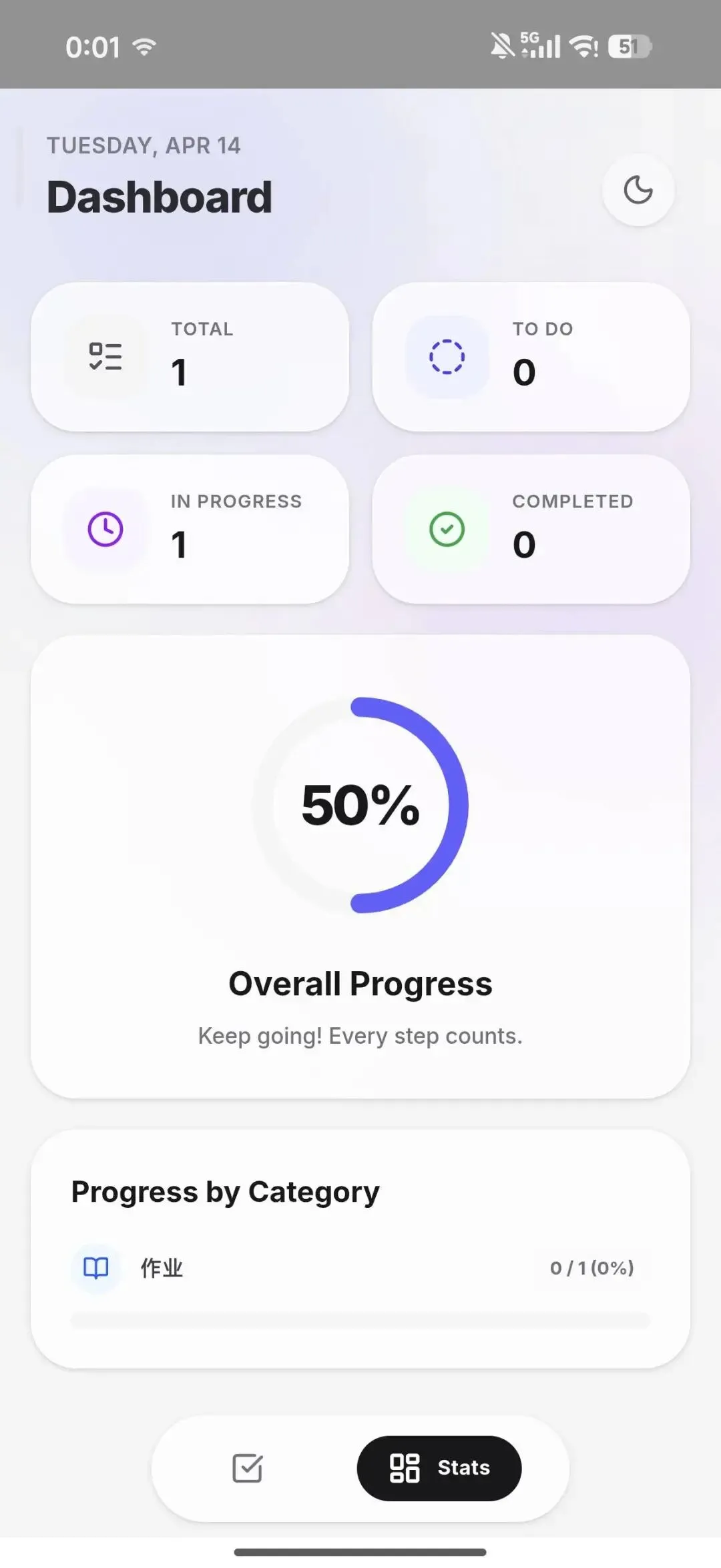 我比较喜欢直接看到任务的进度,但一直苦于没有特别符合我胃口的app,突然想到之前注了Google ai studio的账号,所以就尝试第一次vibe coding 一个app。