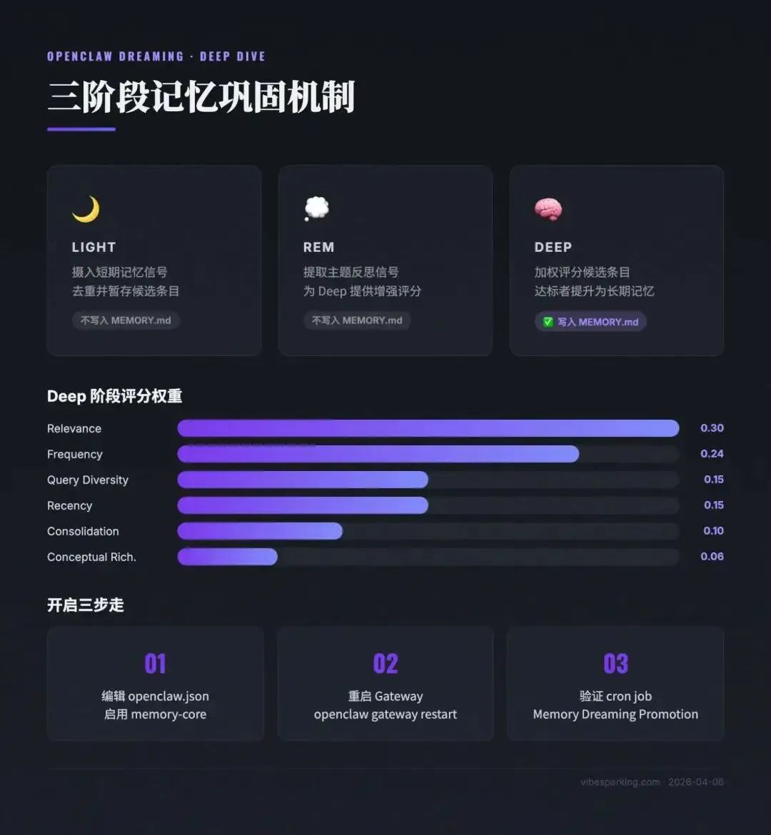 Dreaming 是 OpenClaw memory-core 插件的后台记忆整合系统。它模拟人类睡眠中的记忆巩固过程,自动将高频、高相关性的短期记忆提升为持久长期记忆(写入 MEMORY.md)。