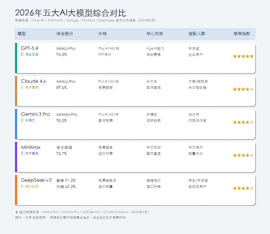_数据来源:OpenAI、Anthropic、Google、MiniMax、DeepSeek官方公开信息(2026年4月)_