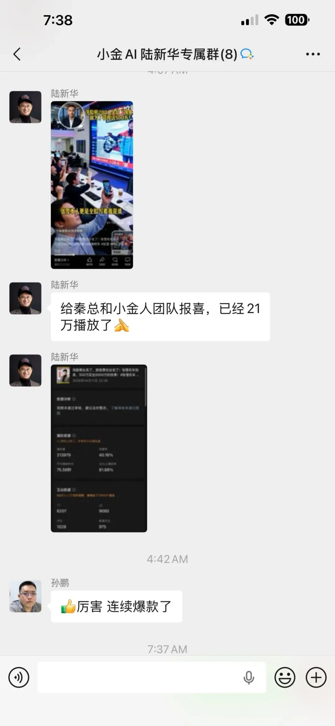 「给秦总和小金人团队报喜,已经21万播放了。」