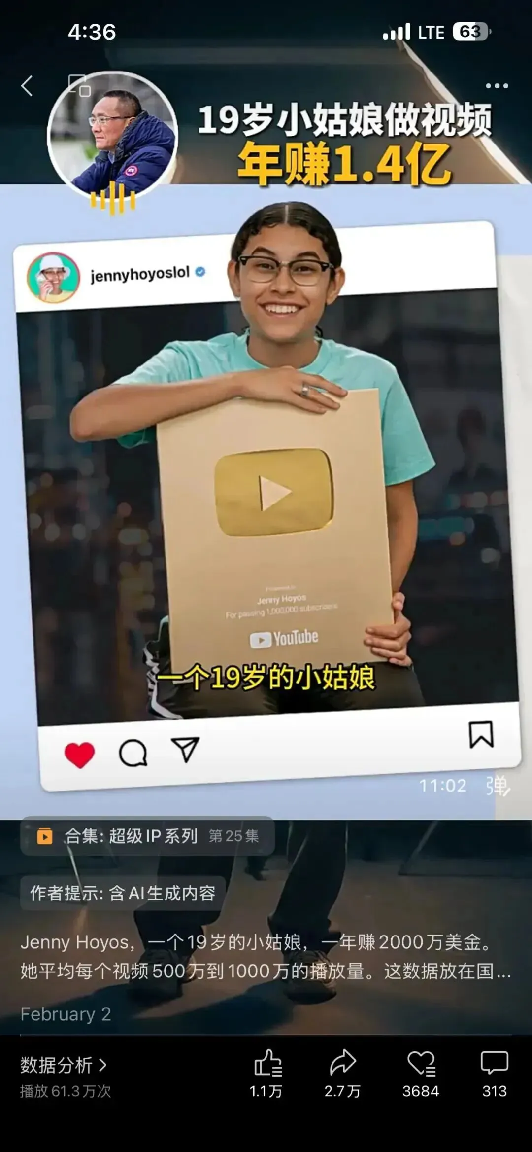 那个女生叫Jenny Hoyos,那时候她的YouTube订阅量是915万,月收入估算——22到34万美元。