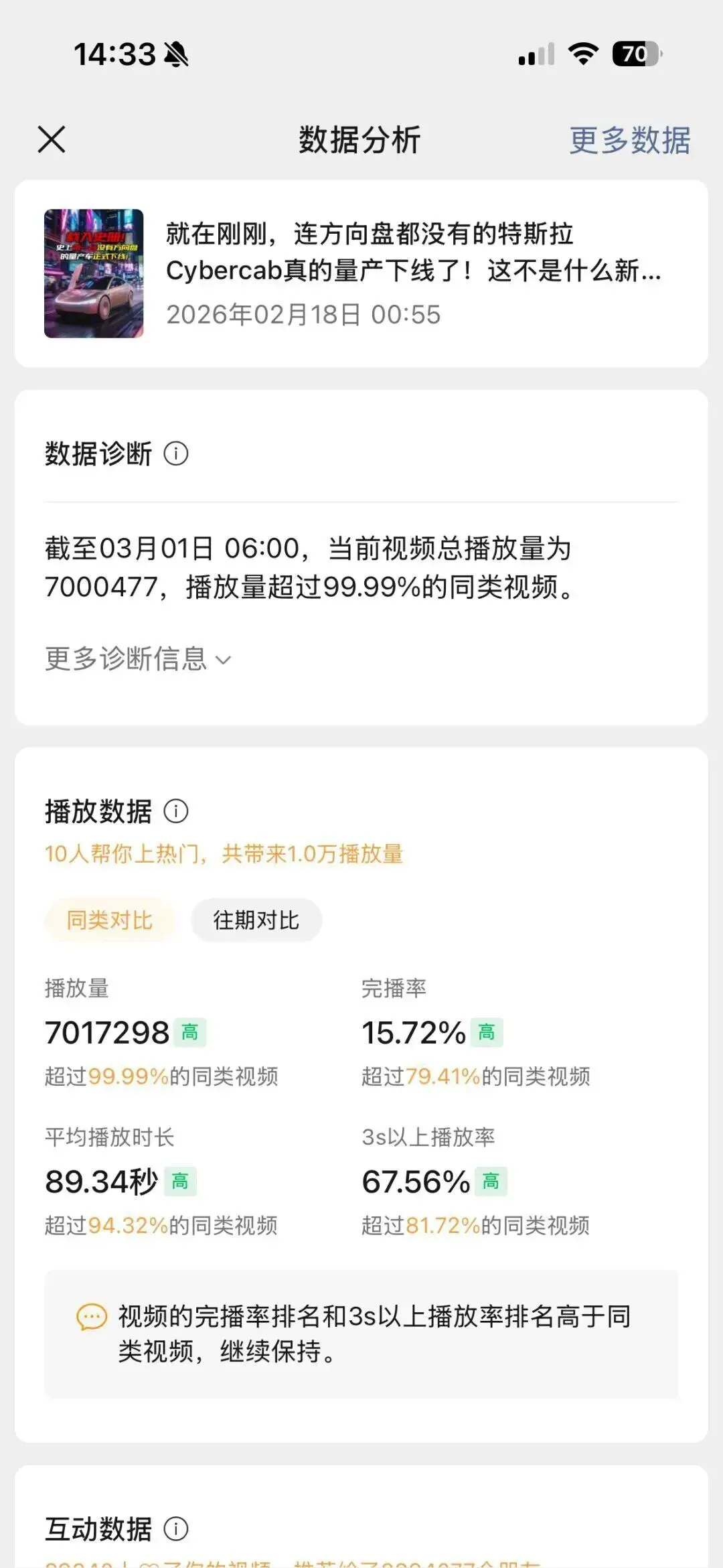 我自己的账号:一条61万播放,2.7万分享。
