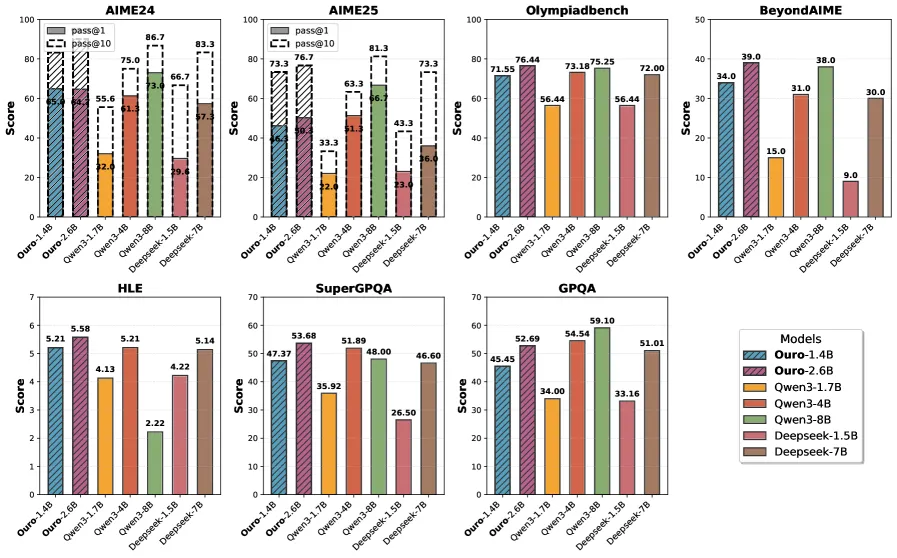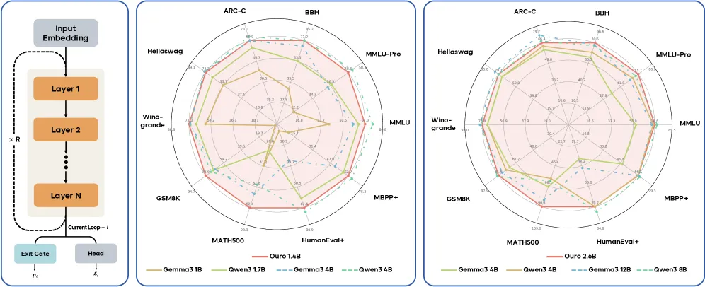 Ouro开源了两个规模的模型:Ouro 1.4B和Ouro 2.6B。在当今大模型生态中,主流开放权重模型参数量动辄7B、13B甚至70B起步,1.4B和2.6B在很多人认知里还停留在"玩具模型"阶段。